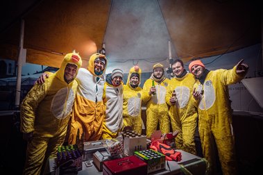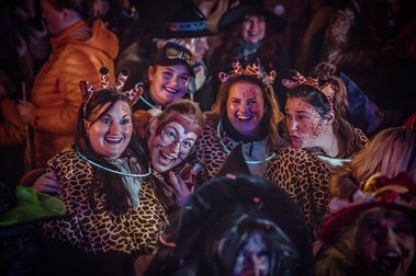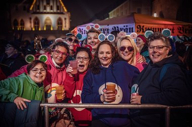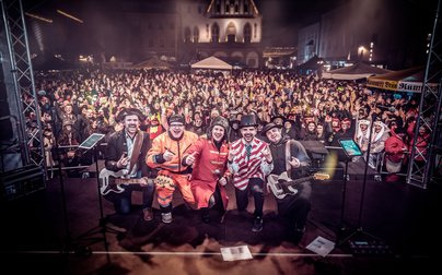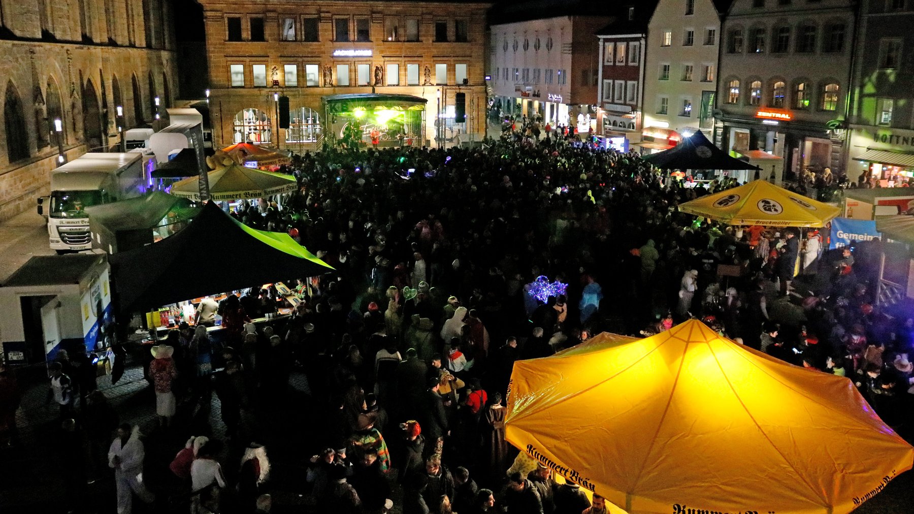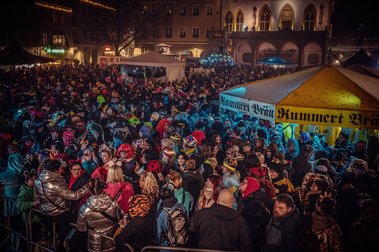 Tausende verkleidete Menschen feiern am Amberger Marktplatz auf der größten outdoor-Faschingsparty der Oberpfalz.